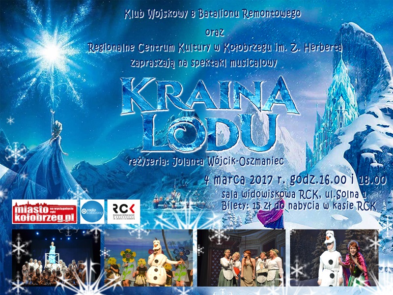 Zapraszamy na musicalową wersję przeboju kinowego W. Disneya „Kraina lodu”. Na scenie sali widowiskowej RCK będzie można śledzić losy Anny wyruszającej na wielką wyprawę, by odnaleźć siostrę Elsę, której magiczna moc uwięziła królestwo Arendelle w okowach wiecznej zimy. Podobnie jak na ekranie w poszukiwaniach towarzyszy jej Kristoff, przed którym górskie szlaki nie kryją żadnych tajemnic i jego lojalny renifer Sven. Podczas misji ocalenia królestwa przyjaciele zmierzą się z surową pogodą, napotkają niebotyczne góry, tajemnicze trolle i zabawnego bałwana o imieniu Olaf. Historia opowiedziana muzyką, piosenkami, z udziałem młodych wykonawców Zespołu Wokalnego „Majol” działającego w Klubie Wojskowym 8 Batalionu Remontowego w Kołobrzegu. Spektakl wyreżyserowała Jolanta Wójcik – Oszmaniec.