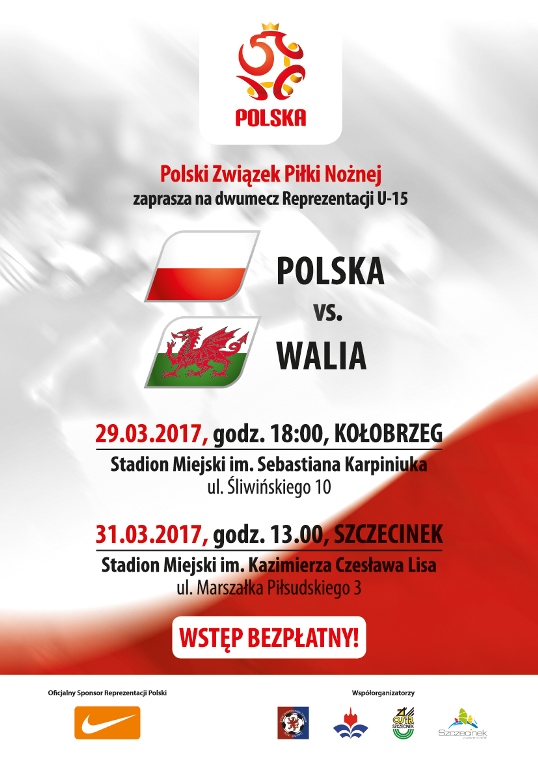 Zapraszamy na mecz U-15: Polska – Walia. Reprezentacja Polski do lat 15 rozegra w Kołobrzegu w dniu 29.03.2017 (środa)  mecz z rówieśnikami z reprezentacji Walii. Spotkanie rozegrane zostanie o godz. 18:00, na Stadionie Miejskim im. Sebastiana Karpiniuka przy ul. Śliwińskiego.