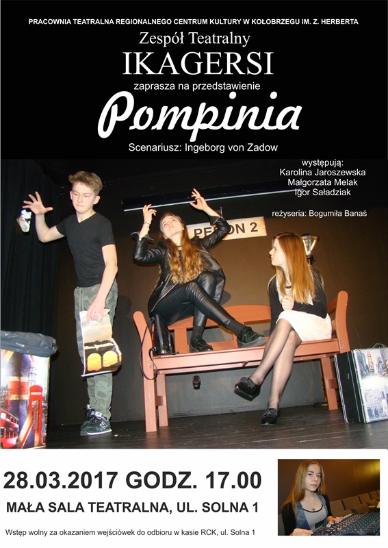 Z okazji Międzynarodowego Dnia Teatru zapraszamy 28.03.2017, g. 17:00, Mała sala teatralna na spektakl "Pompinia" w wykonaniu Zespołu teatralnego IKAGERSI z RCK. Scenariusz: Ingeborg von Zadov. Spektakl jest ciekawą opowieścią  o dojrzewającej w młodych ludziach świadomości takich znaczeń, jak miłość czy przyjaźń.