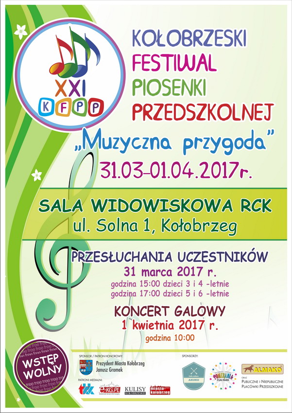 W tym roku do XXI Kołobrzeskiego Festiwalu Piosenki Przedszkolnej zgłoszono 73 przedszkolaków z publicznych i niepublicznych przedszkoli i oddziałów przedszkolnych z Kołobrzegu i powiatu kołobrzeskiego. Dzieci będą prezentowały swoje umiejętności podczas koncertu przesłuchań w piątek 31 marca 2017 roku.