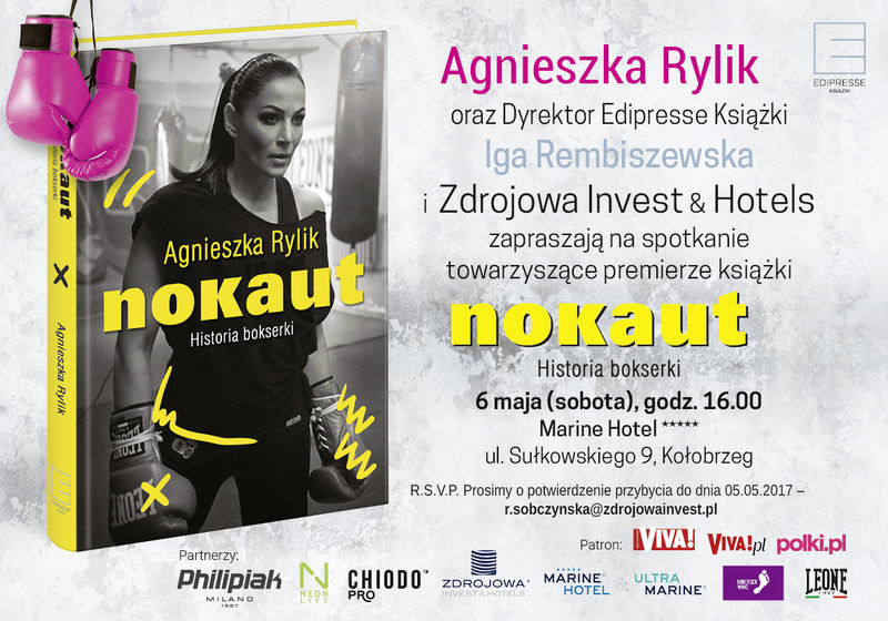 Zapraszamy w dniu 6.05.2017 r. (sobota) do Hotelu Marine na Spotkanie z Agnieszką Rylik - towarzyszące premierze książki NOKAUT. Agnieszka Rylik: „Opowiadam w niej o drodze z Kołobrzegu do Madison Square Garden i cenie, jaką musiałam zapłacić za sukces. O wielkim boksie i jego kulisach, karierze w mediach i o życiu prywatnym”.