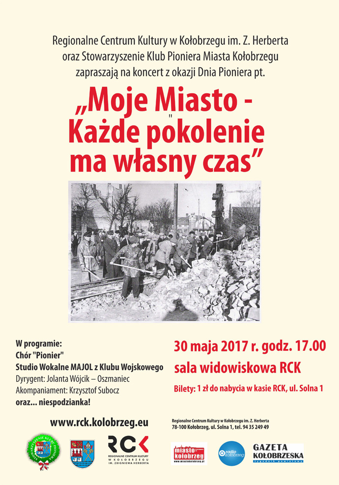 Ostatni dzień maja - 31 obchodzony jest w Kołobrzegu jako Dzień Pioniera. Z tej okazji od 6-ciu lat odbywają się w mieście specjalne uroczystości okolicznościowe organizowane przez inicjatora tego święta - Stowarzyszenie Klub Pioniera Miasta Kołobrzeg, przy wsparciu Prezydenta Miasta Kołobrzeg i Regionalnego Centrum Kultury w Kołobrzegu. Zapraszamy na koncert dedykowany pierwszym polskim mieszkańcom ziemi kołobrzeskiej, w którym wystąpi reprezentujący środowisko pionierskie chór „Pionier” prowadzony przez Jolantę Wójcik-Oszmaniec oraz Studio Wokalne MAJOL z Klubu Wojskowego. Przy fortepianie zasiądzie Krzysztof Subocz. Koncert odbędzie się 30 maja o godz. 17.00 w sali widowiskowej RCK. Wstęp wolny.