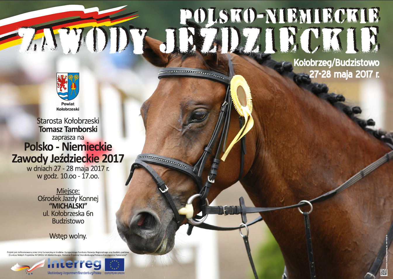 Serdecznie zapraszamy na kolejną edycję Polsko - Niemieckich Zawodów Jeździeckich, które odbędą się w dniach 27-28 maja 2017 roku w Ośrodku Jazdy Konnej „Michalski" przy ul. Kołobrzeska 6n w Budzistowie. Oficjalne otwarcie zawodów odbędzie się w sobotę 27 maja 2017 roku o godzinie 10.00. Zawody odbywają się dzięki współpracy z klubem jeździeckim z Niemiec. Głównym celem imprezy jest podtrzymywanie wieloletniej współpracy międzynarodowej. Zawody są inicjatywą, która sprzyja lepszemu poznaniu się, wymianie doświadczeń, wspiera aktywne formy wypoczynku, a nade wszystko przyczynia się do kultywowania tradycji i sztuki jeździectwa oraz łączenia kultur mieszkańców. Wszystkie działania realizowane w ramach projektu przyniosą wiele korzyści dla współpracy oraz efektu transgraniczności pomiędzy obszarami wsparcia. W zawodach weźmie udział 40 uczestników wraz z końmi, w tym 20 zawodników z Polski oraz 20 zawodników z Niemiec. Zawodnicy walczyć będą w konkursie skoków przez przeszkody m.in. w klasie:
