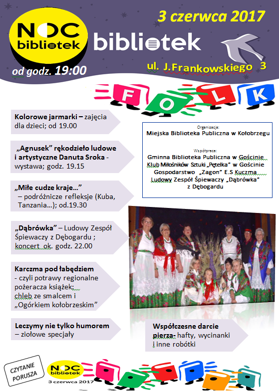 Serdecznie zapraszamy dzieci i dorosłych 3 czerwca na kolejne wydanie Nocy bibliotek. Start od godziny 19.00 W programie m.in. warsztaty gliniarskie dla dzieci; wystawa rękodzieła ludowego i artystycznego; wspominki z podróży (Kuba, Tanzania); ziołowe specjały; potrawy regionalne; Ludowy Zespół Śpiewaczy z Dębogardu.