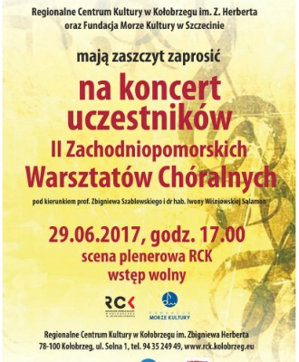 Zapraszamy na koncert uczestników 2 edycji Zachodniopomorskich Warsztatów Chóralnych w Kołobrzegu. Zajęcia warsztatowe prowadzą specjaliści w dziedzinie chóralistyki i dyrygentury: prof. Zbigniew Szablewski (Uniwersytet Muzyczny Fryderyka Chopina) i dr hab. Iwona Wiśniewska - Salamon (Uniwersytet Zielonogórski). Koncert prezentujący efekty warsztatów odbędzie się 29 czerwca 2017 r. o godz. 17.00 na scenie plenerowej RCK. Wstęp wolny.